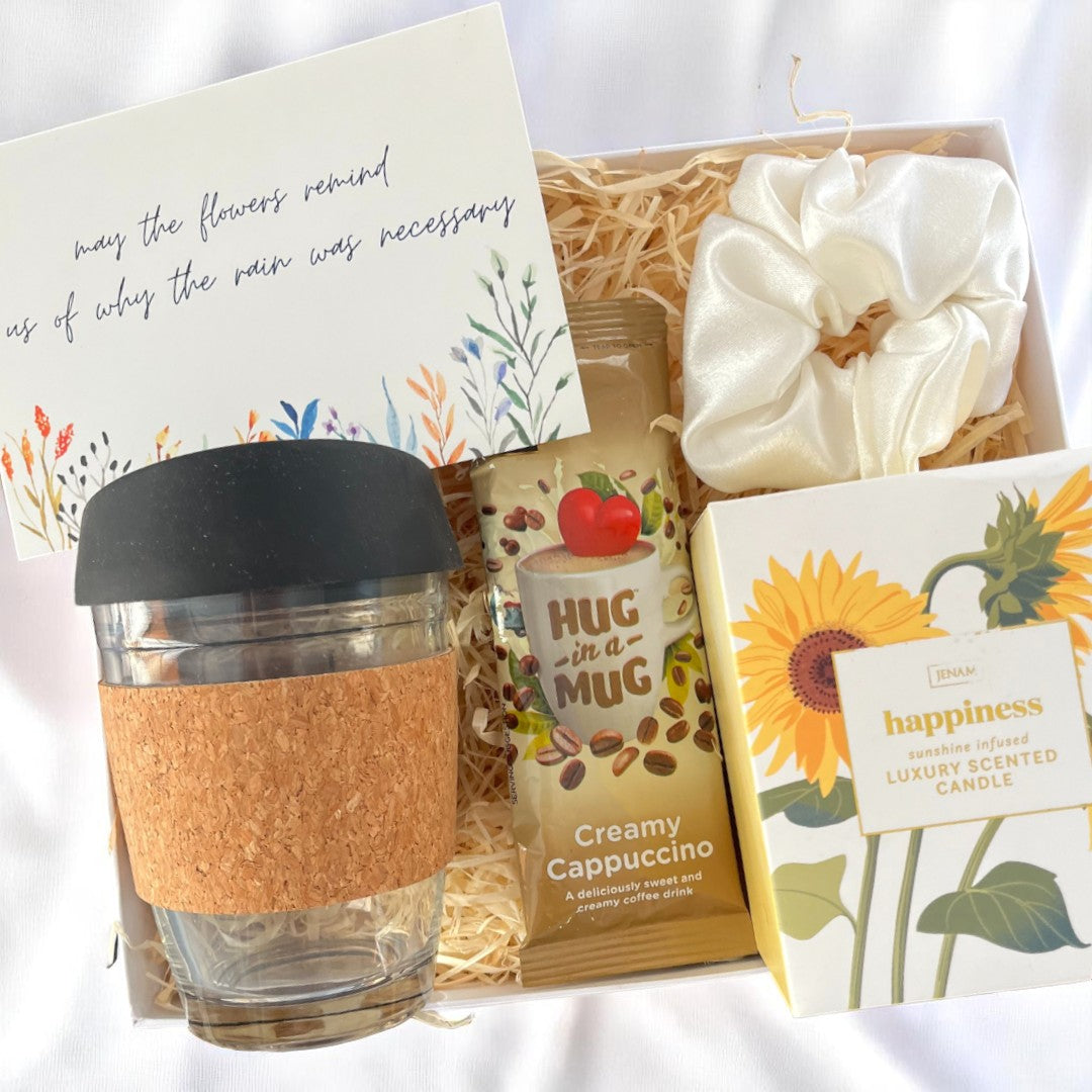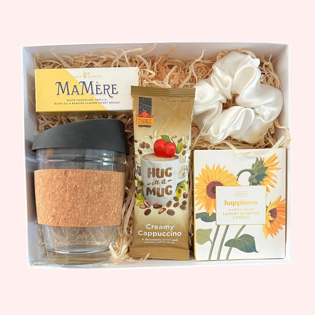 Packed with gentle goodies, from a delish nougat bar, giant scented candle and a glass and cork travel mug, this box is aimed to gift a sense of joy the moment it's opened.